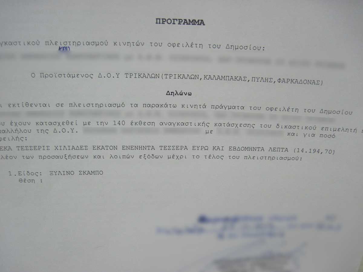 Την ίδια στιγμή, το Δημόσιο κατάσχεσε από τον άλλο κάτοικο των Τρικάλωνμία καρέκλα γραφείου, μαζί με το γραφείο. Πρώτη τιμής εκκίνησης για το συγκεκριμένο σετ επίπλων είναι τα 150 ευρώ.