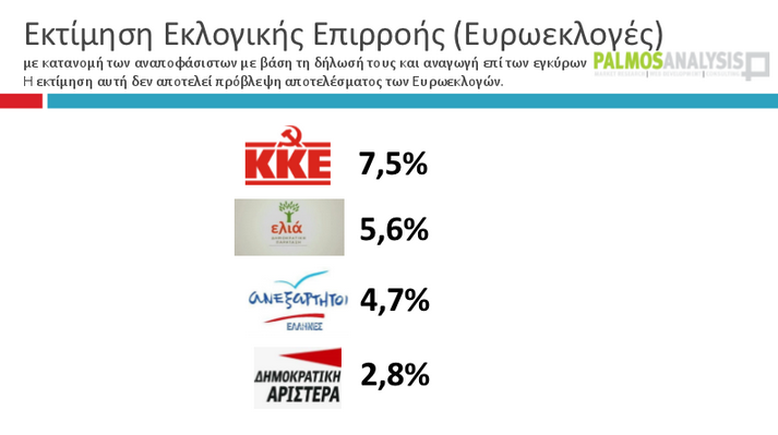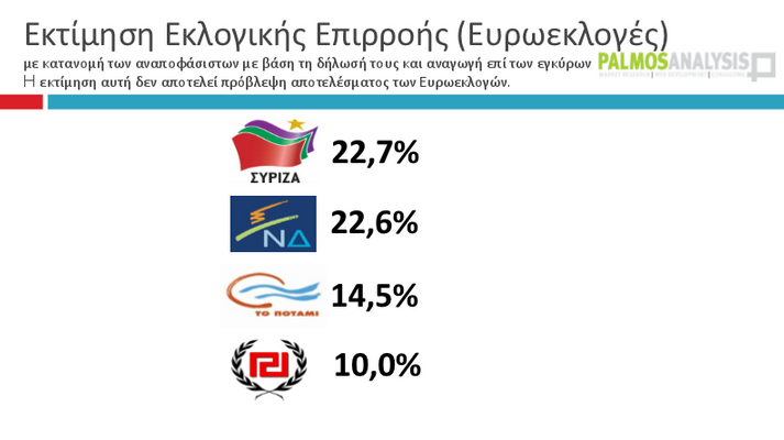 Στην εκτίμηση εκλογικής επιρροής για τις ευρωεκλογές ο ΣΥΡΙΖΑ συγκεντρώνει 22,7%, η ΝΔ 22,6% και το Ποτάμι 14,5%. Η Χρυσή Αυγή 10%, το ΚΚΕ 7,5%, η ΕΛΙΑ 5,6%, οι Ανεξάρτητοι Έλληνες 4,7% και η ΔΗΜΑΡ 2,8%.