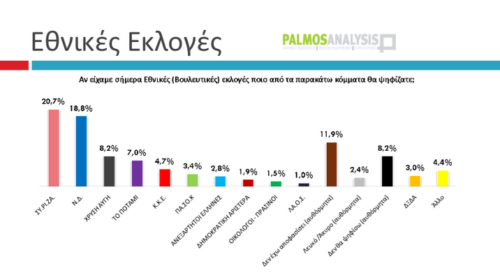 Νέα δημοσκόπηση της Palmos Analysis που δημοσιεύει το tvxs.gr καταγράφει, για τις εθνικές εκλογές, προβάδισμα δύο μονάδων για τον ΣΥΡΙΖΑ με 20,7% έναντι 18,8% της ΝΔ. Στο 8,2% η Χρυσή Αυγή, ενώ το Ποτάμι βρίσκεται στο 7%.